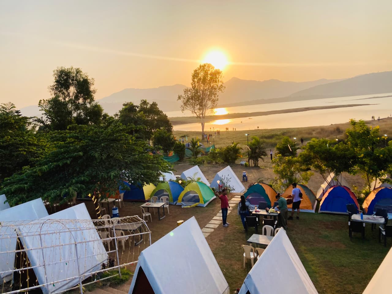 Stay in a cozy tent at Camp Pawna and enjoy a peaceful night by the lakeside, surrounded by hills, fresh air, and beautiful sunset views—perfect for a relaxing outdoor getaway.